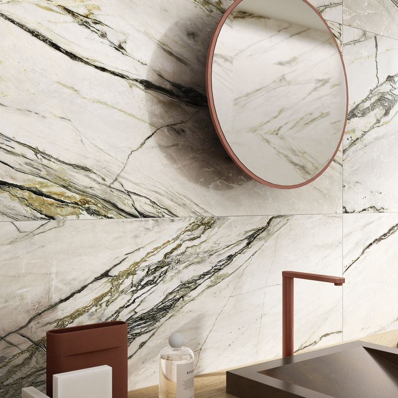 Calacatta spojuje čistotu bílého mramoru s jemnými barevnými akcenty inspirovanými drahými kameny a ušlechtilými kovy. Vytváří luxusní, harmonický povrch vhodný pro moderní i reprezentativní interiéry.