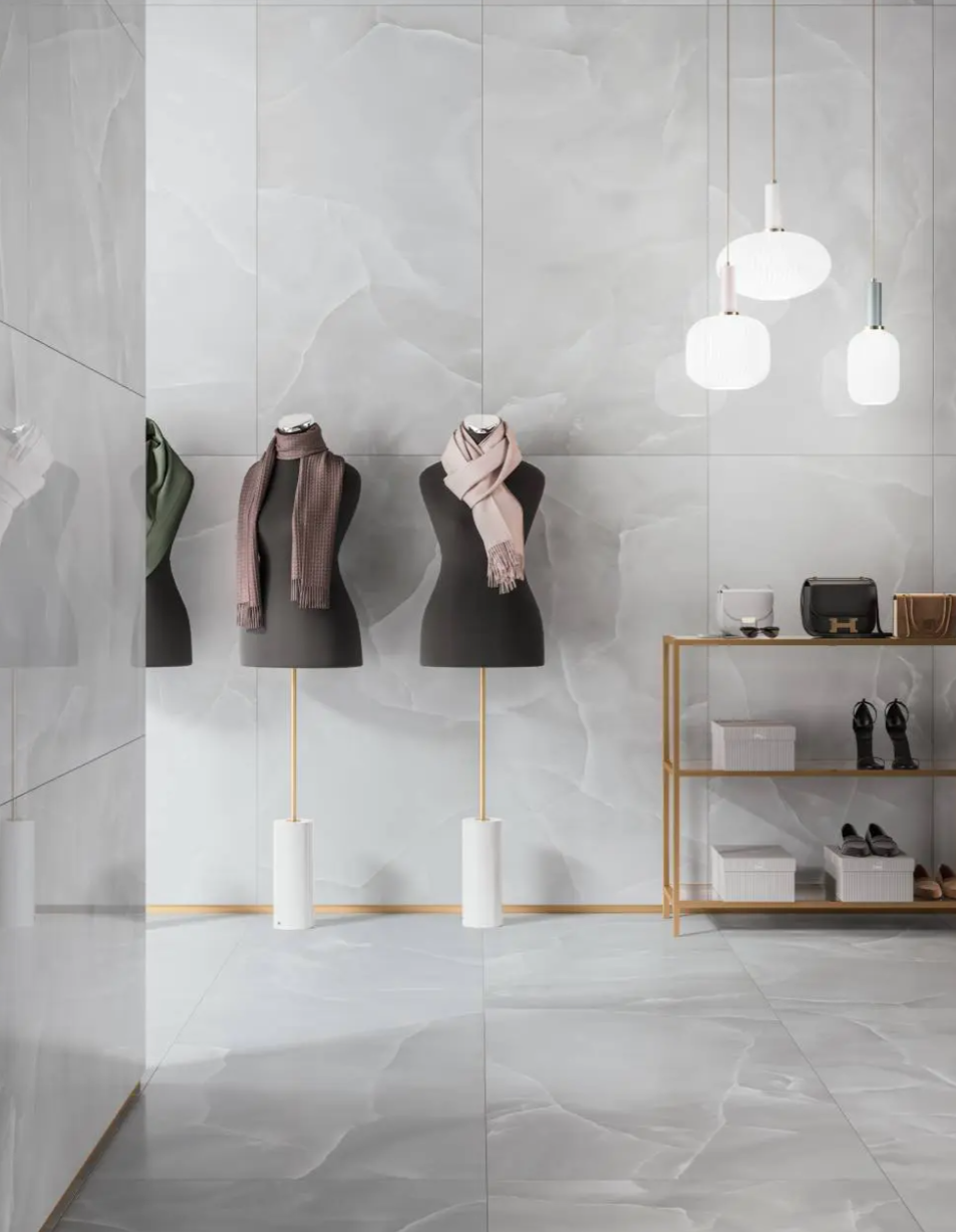 Kolekce reinterpretující onyx kombinuje luxusní vzhled přírodního kamene s praktickými výhodami keramických dlaždic. Lesklý povrch zvýrazňuje světlo v místnosti a vytváří vizuálně lehký, vzdušný efekt. Jemné grafické vzory dlaždic podtrhují sofistikovanost materiálu a dodávají prostoru estetický dopad s vysokou vizuální hodnotou.