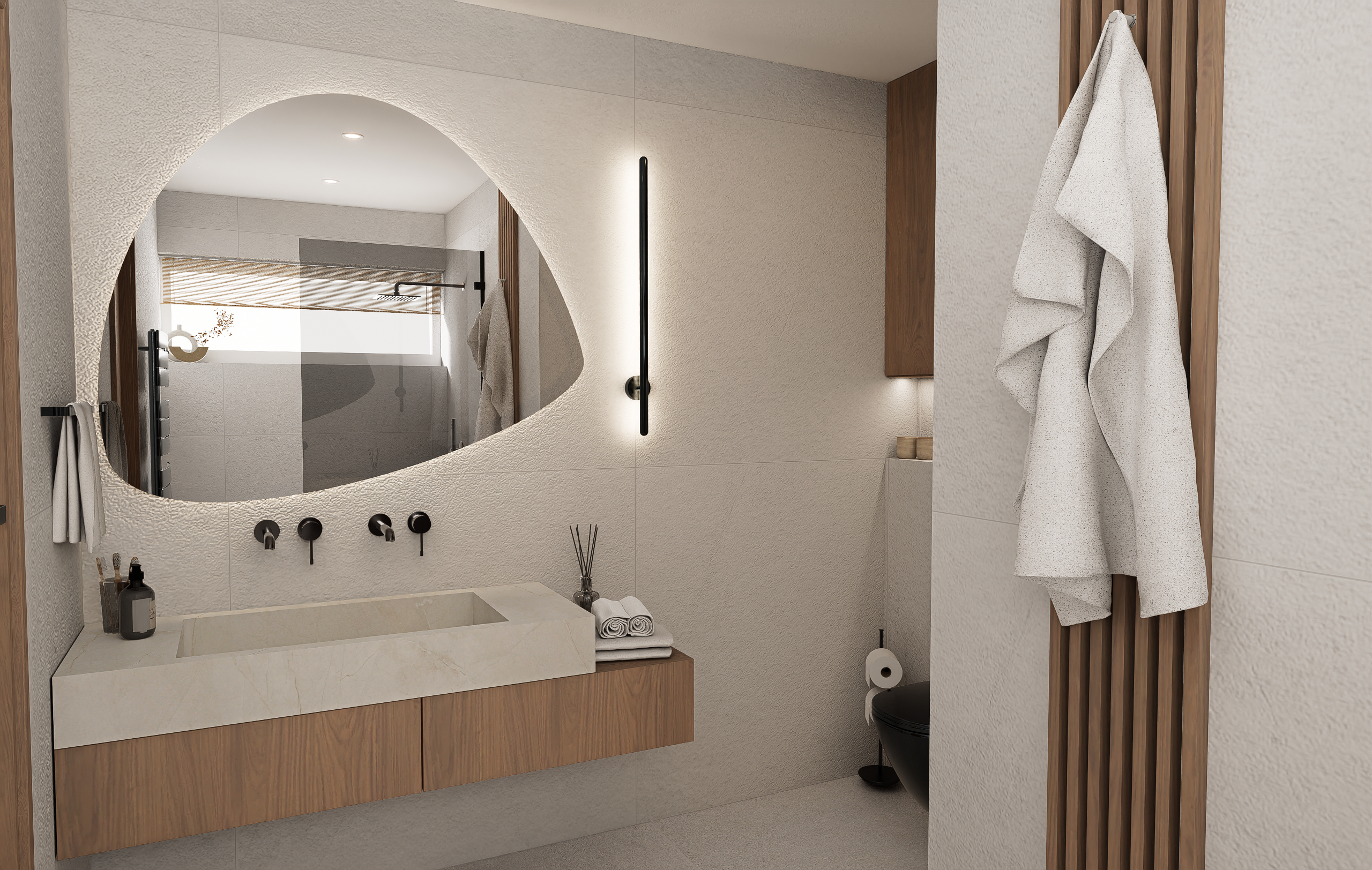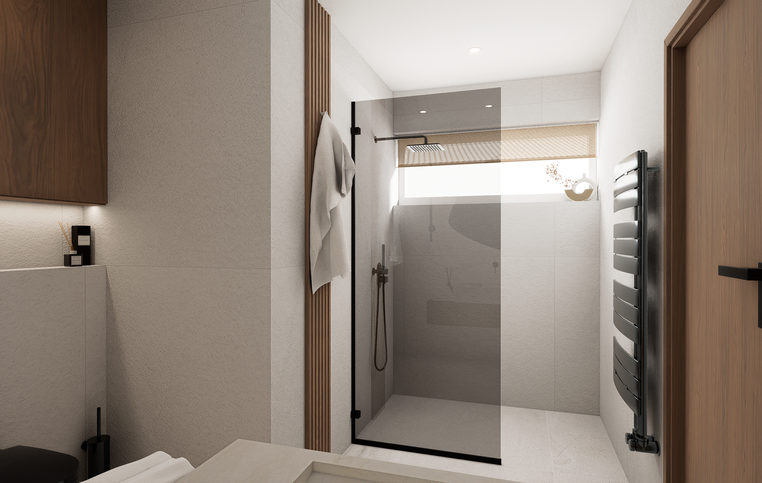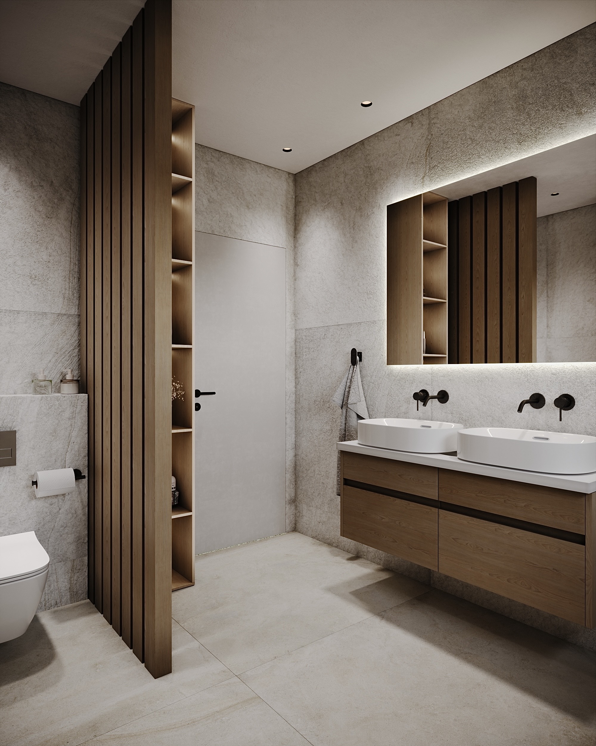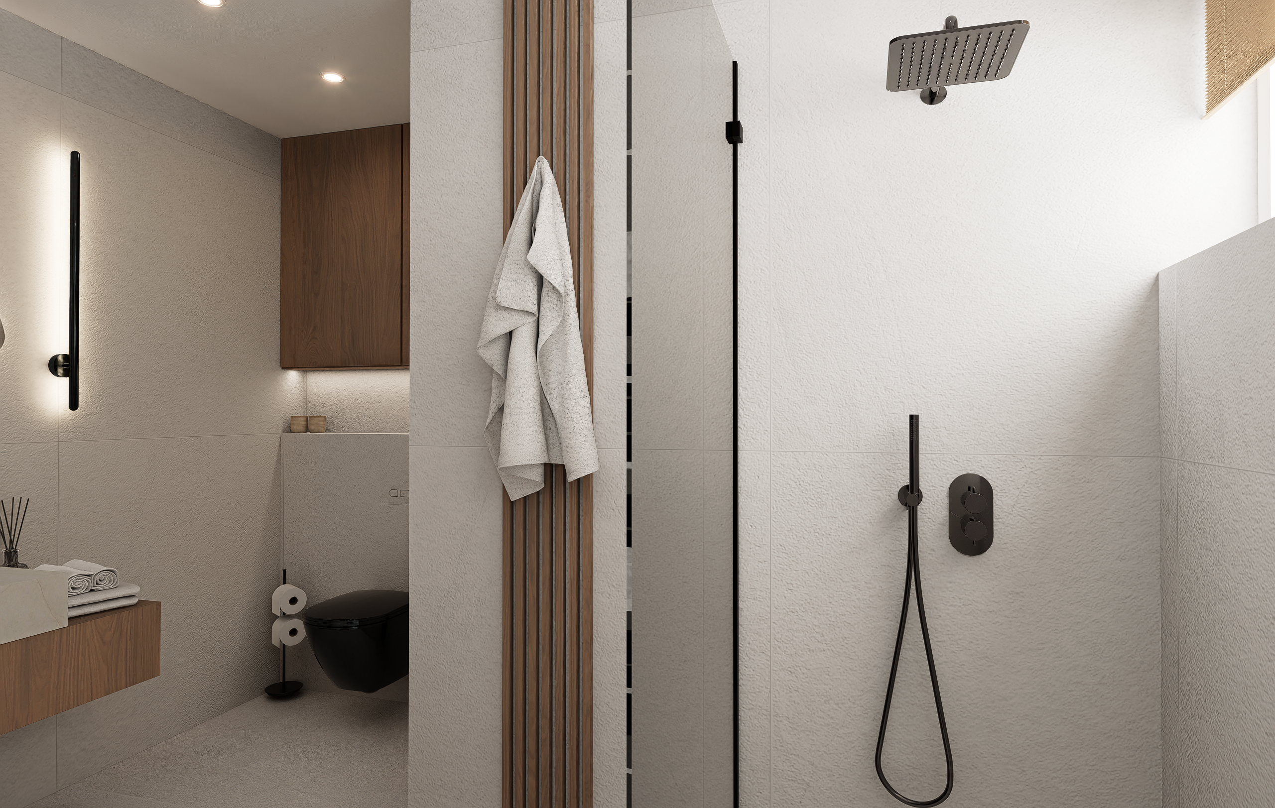 Dubové dřevo, dubové lamely, černé akcenty a struktura na zdech, připomínající welness. Tohle byla touha majitelů této koupelny.