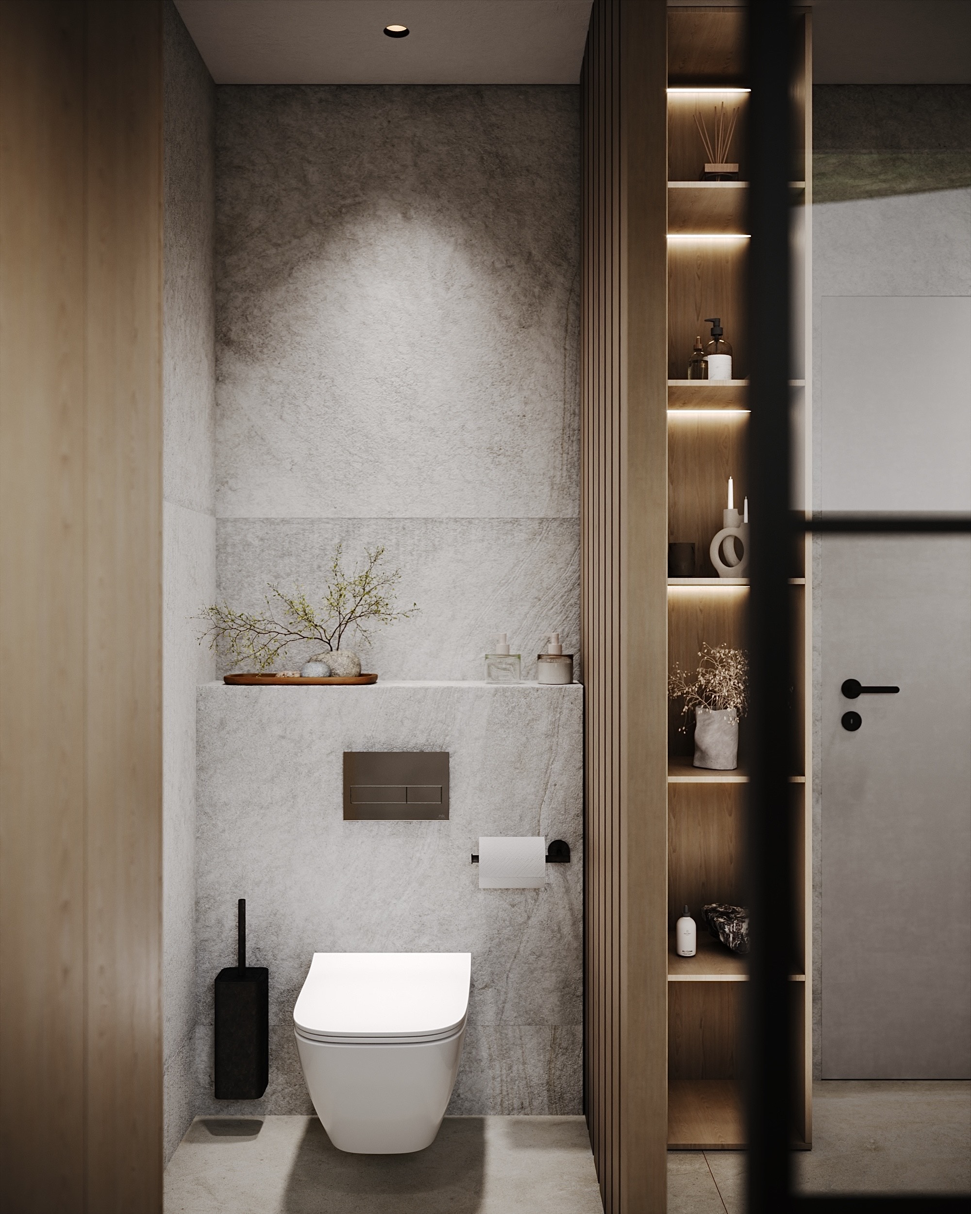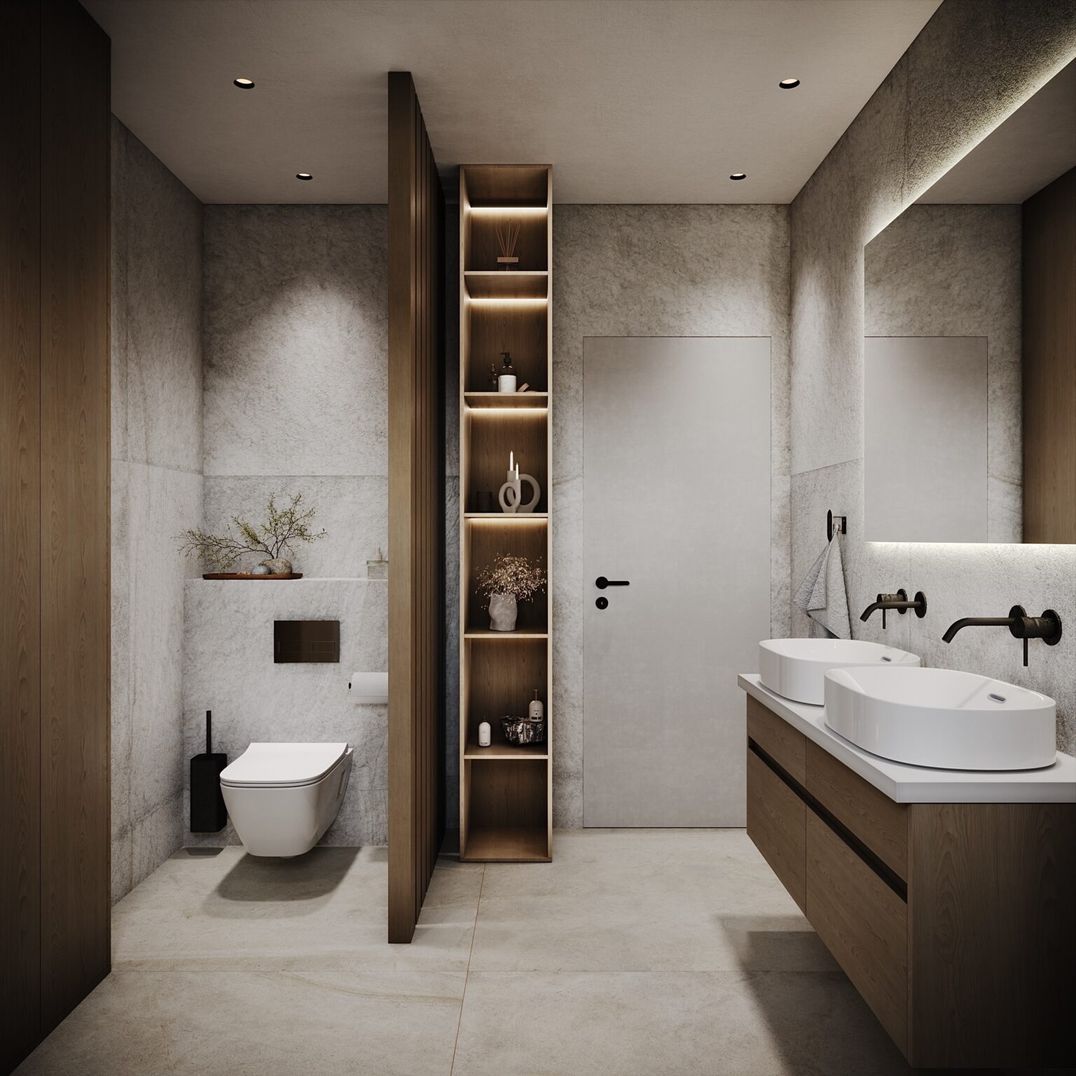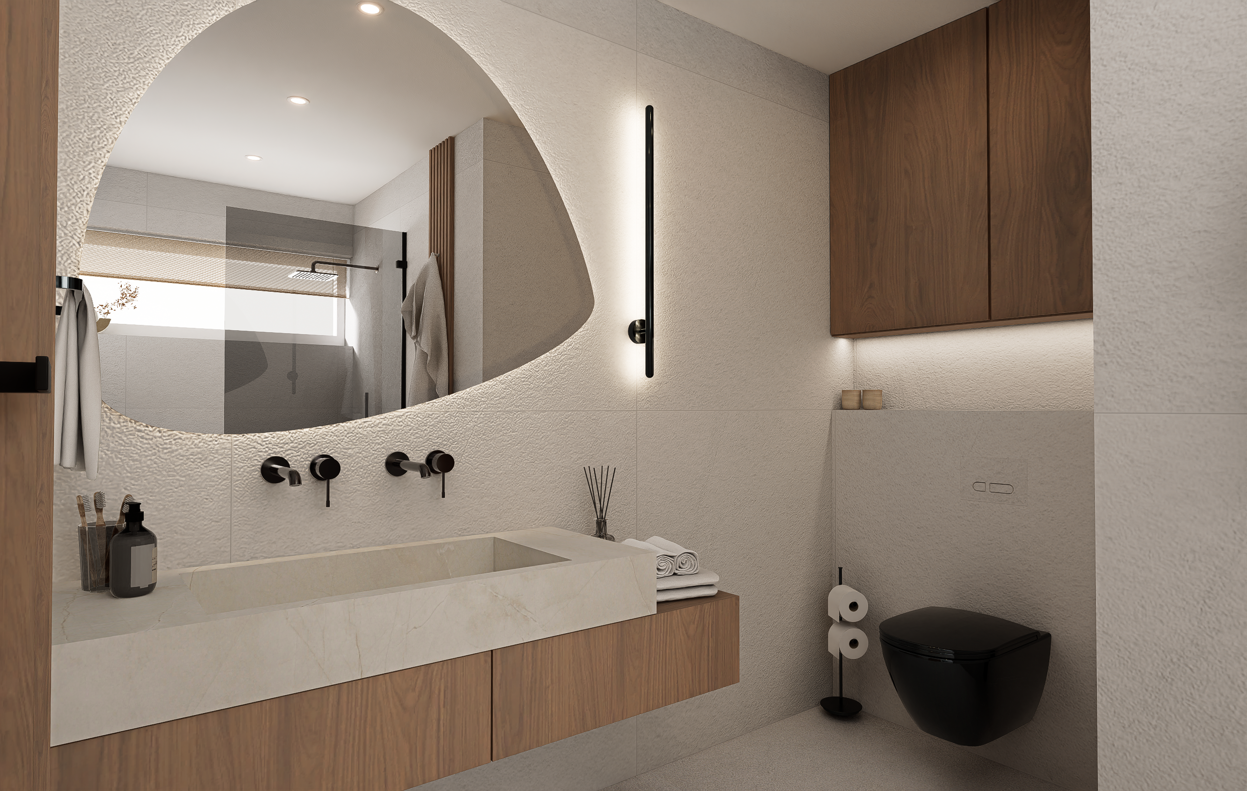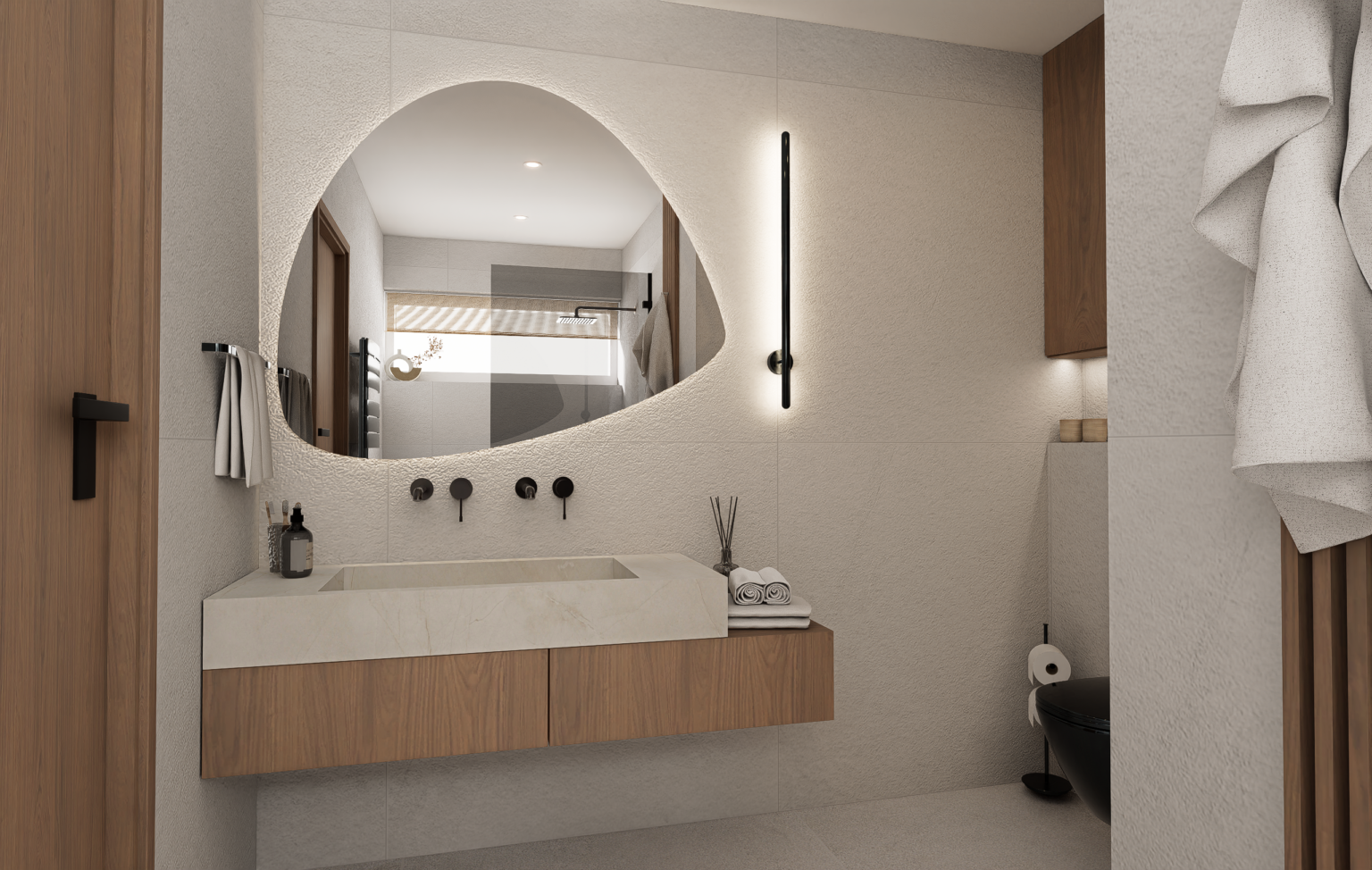 Dubové dřevo, dubové lamely, černé akcenty a struktura na zdech, připomínající welness. Tohle byla touha majitelů této koupelny.