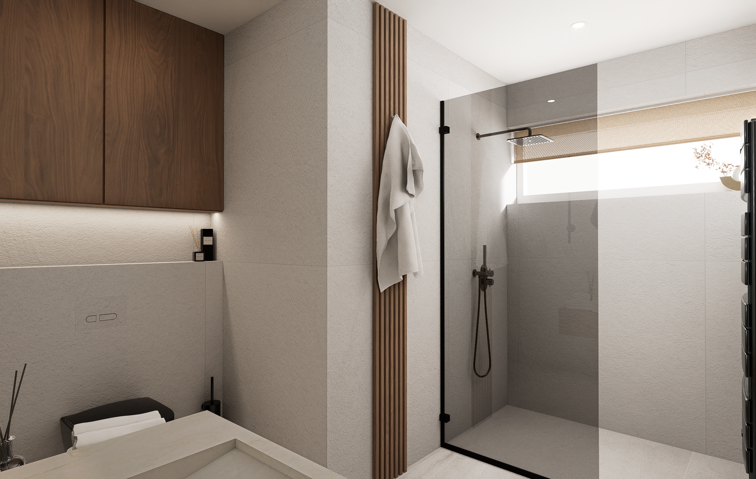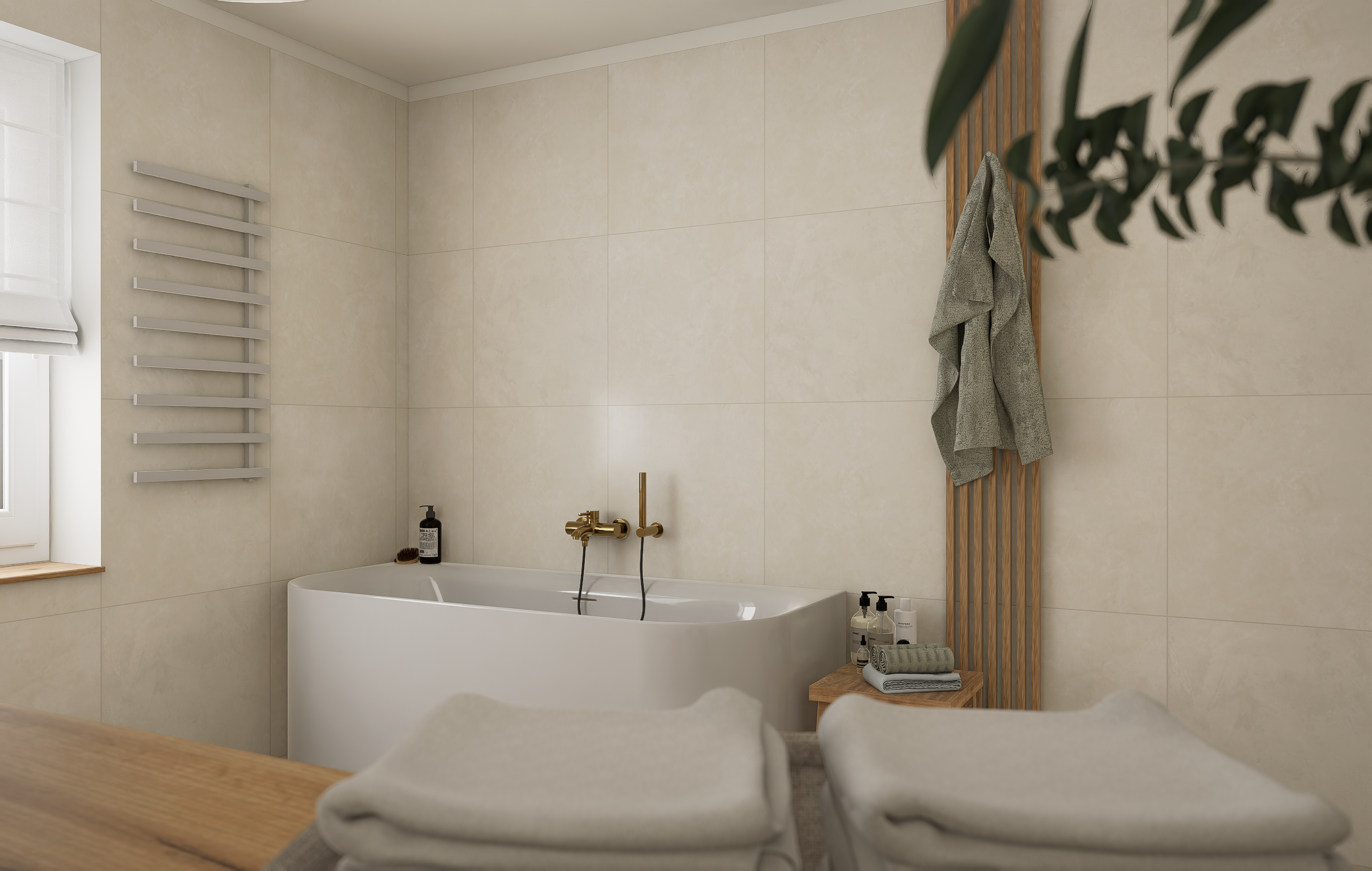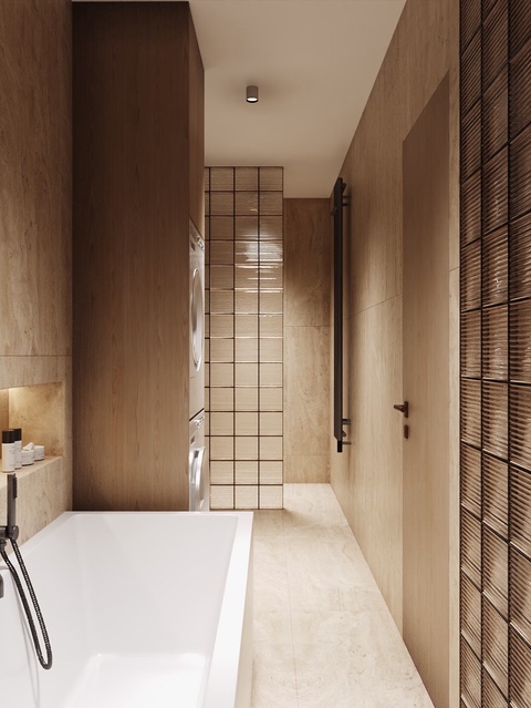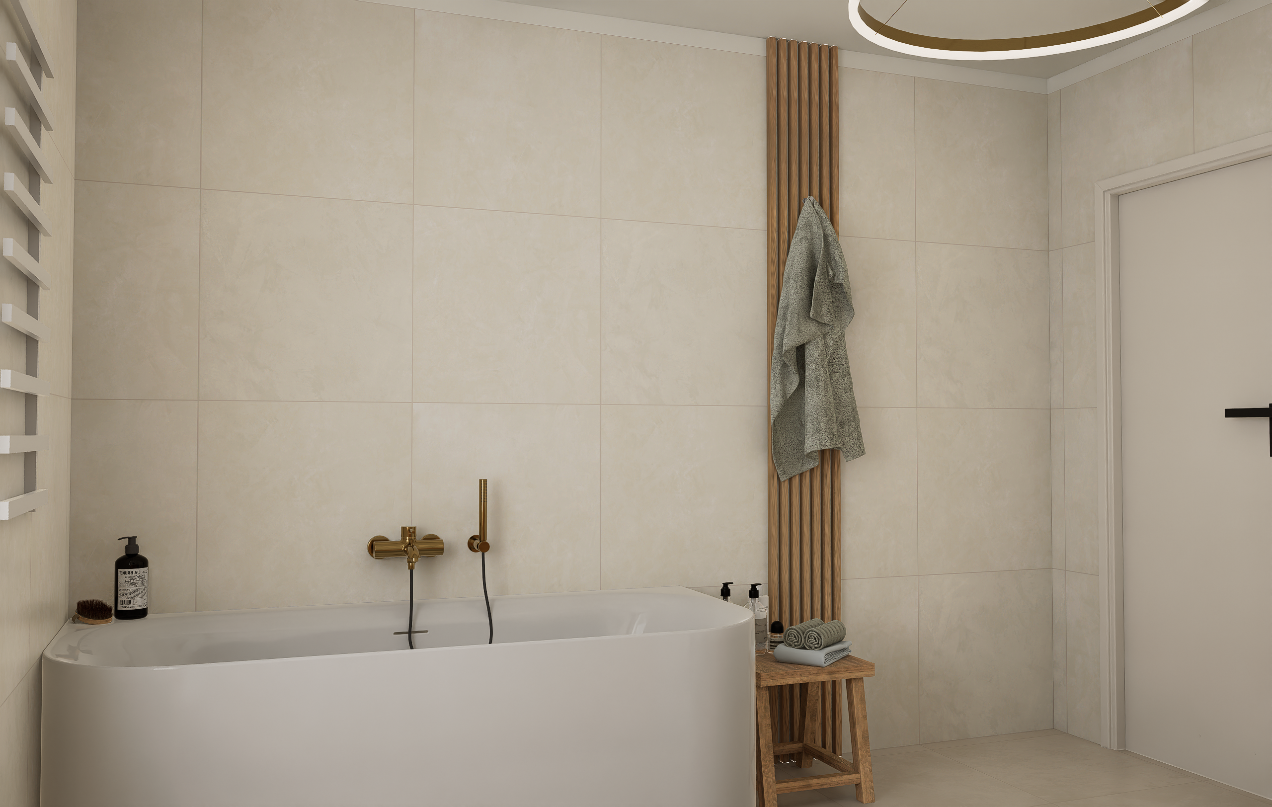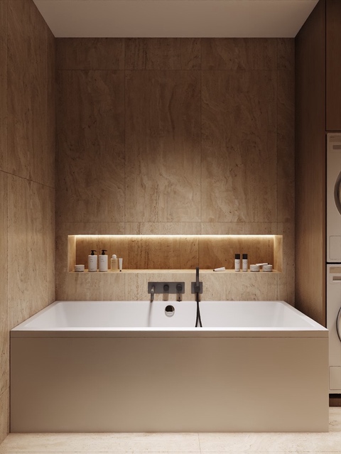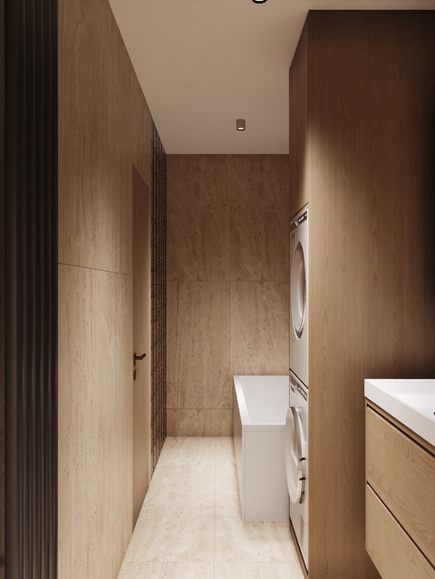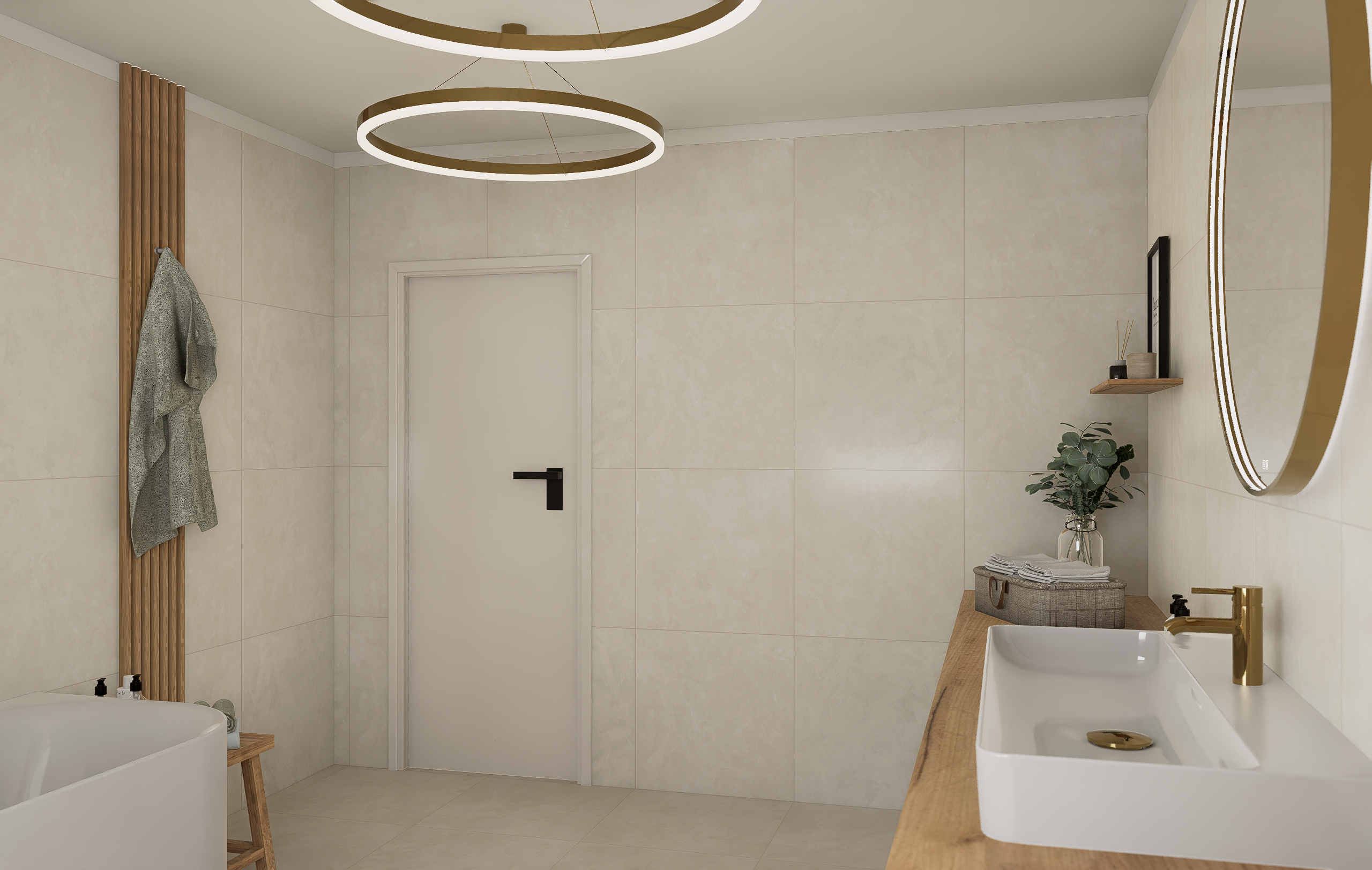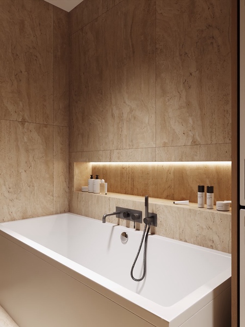 Majitelé se shodli na jemné struktuře ve světlých přírodních tónech na zdech, která doplňuje dlažbu ve stejné sérii v hladké variantě. Dosáhneme tak ideálního monochromatického i spárového matche.