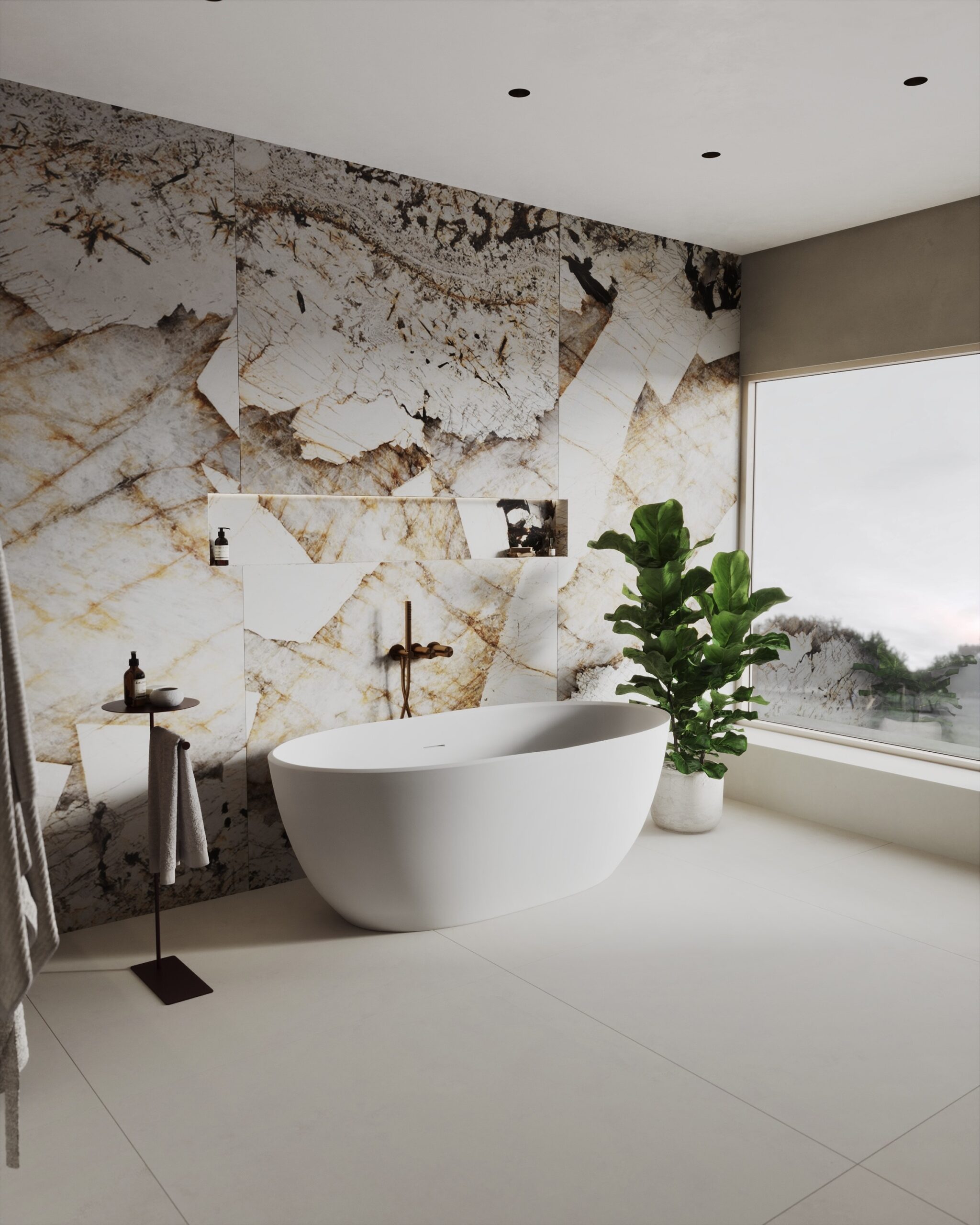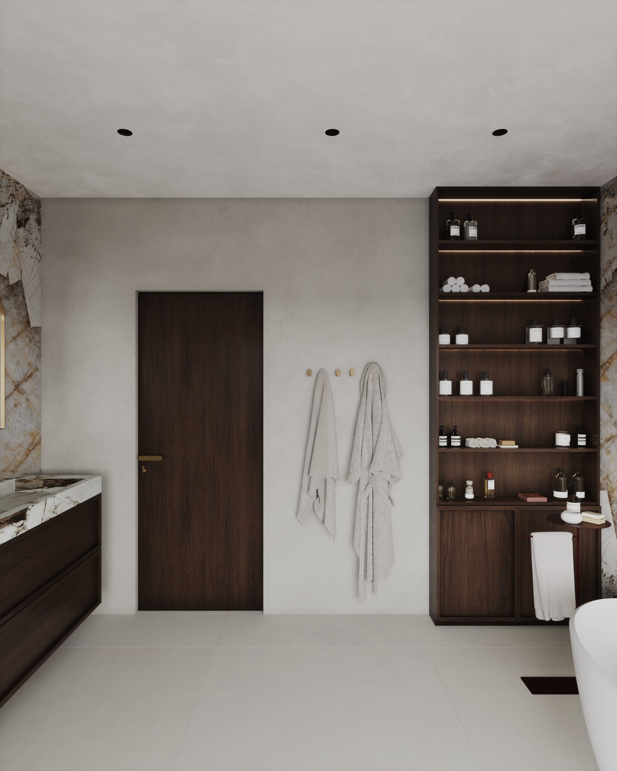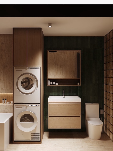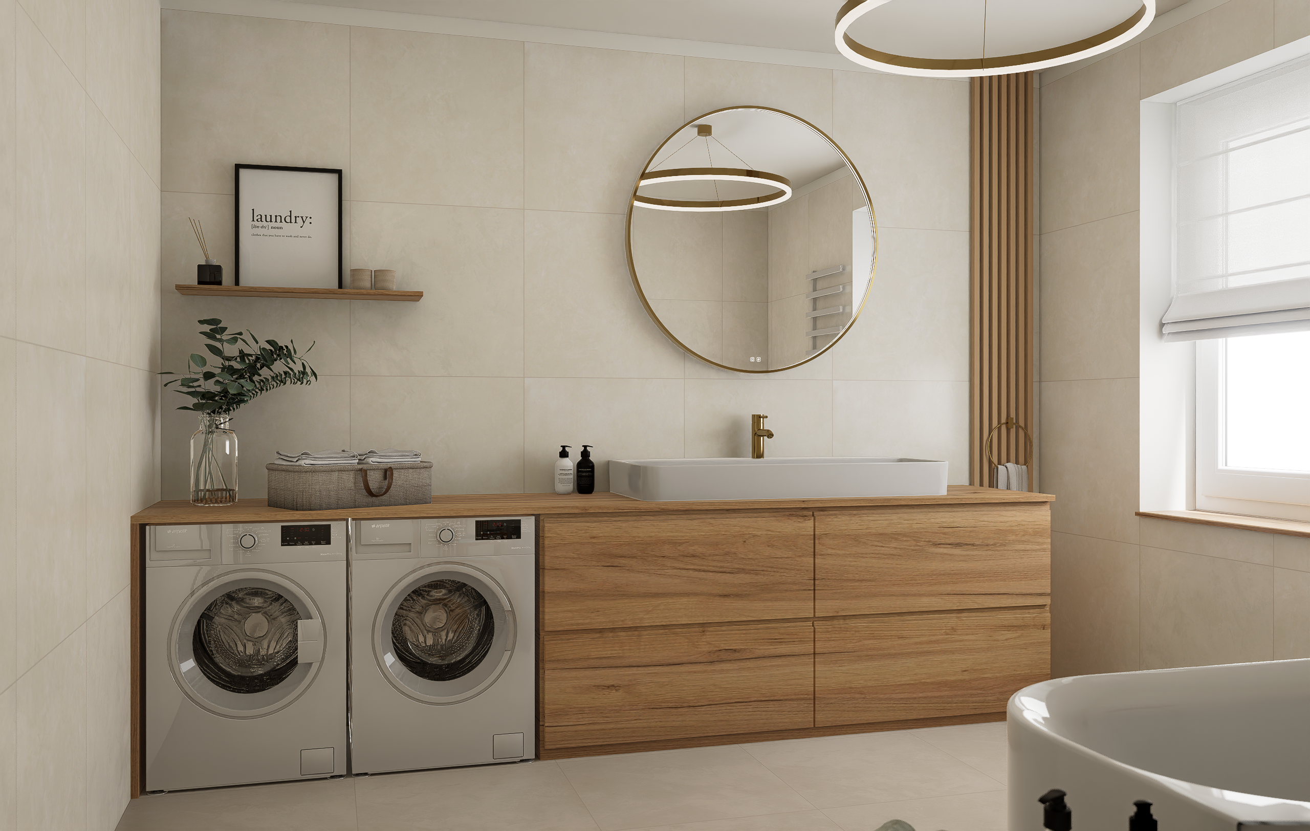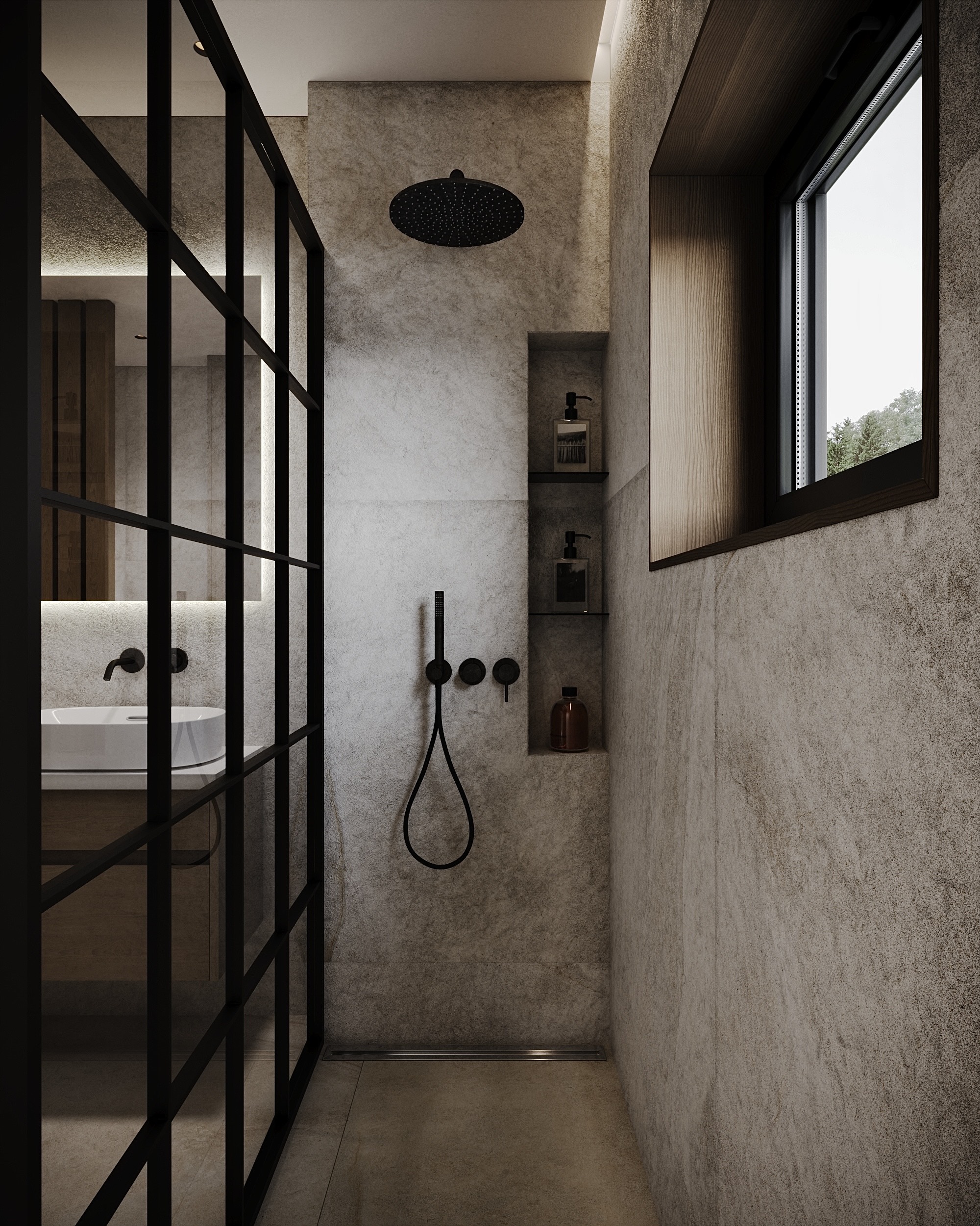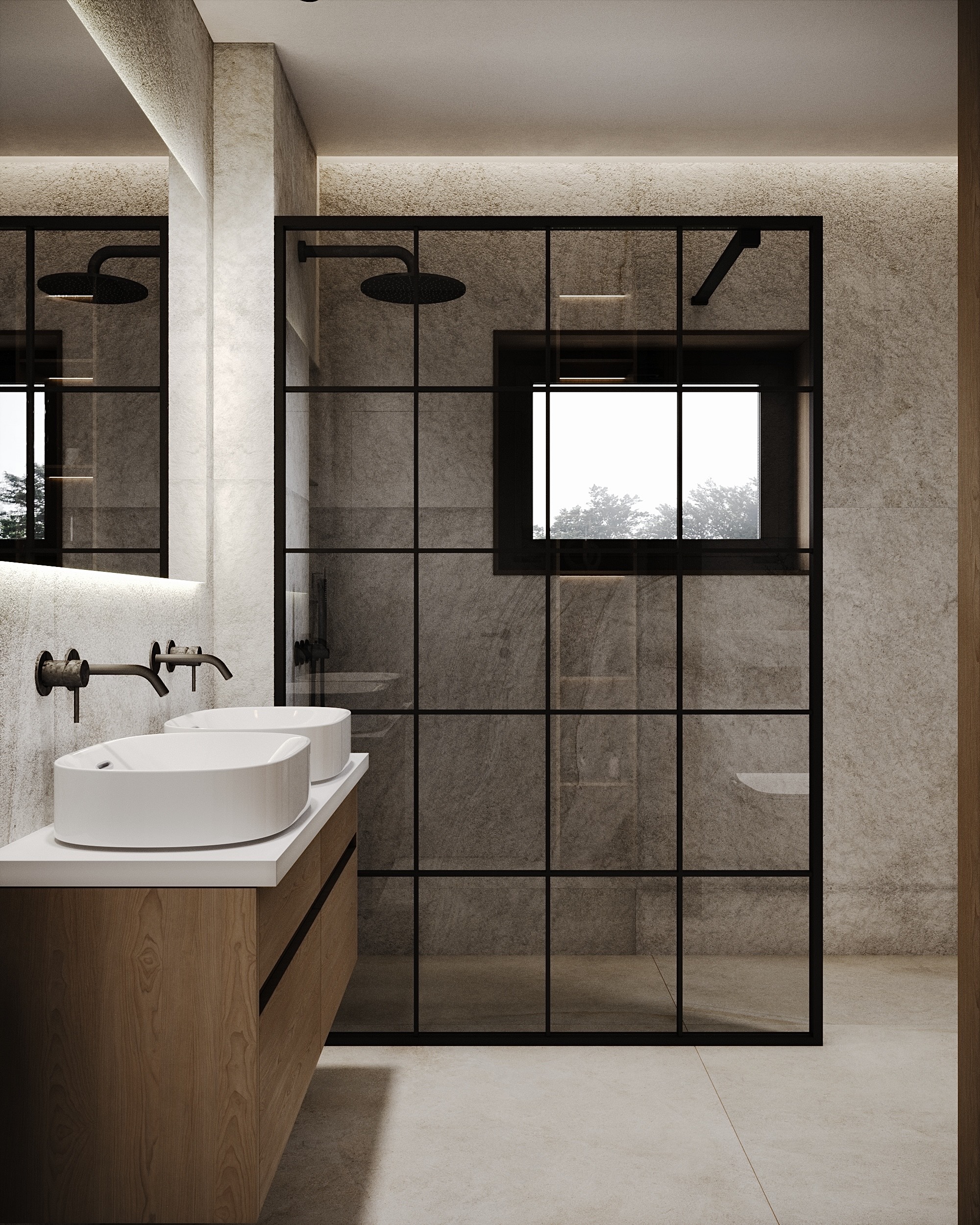 Majitelé se shodli na jemné struktuře ve světlých přírodních tónech na zdech, která doplňuje dlažbu ve stejné sérii v hladké variantě. Dosáhneme tak ideálního monochromatického i spárového matche.