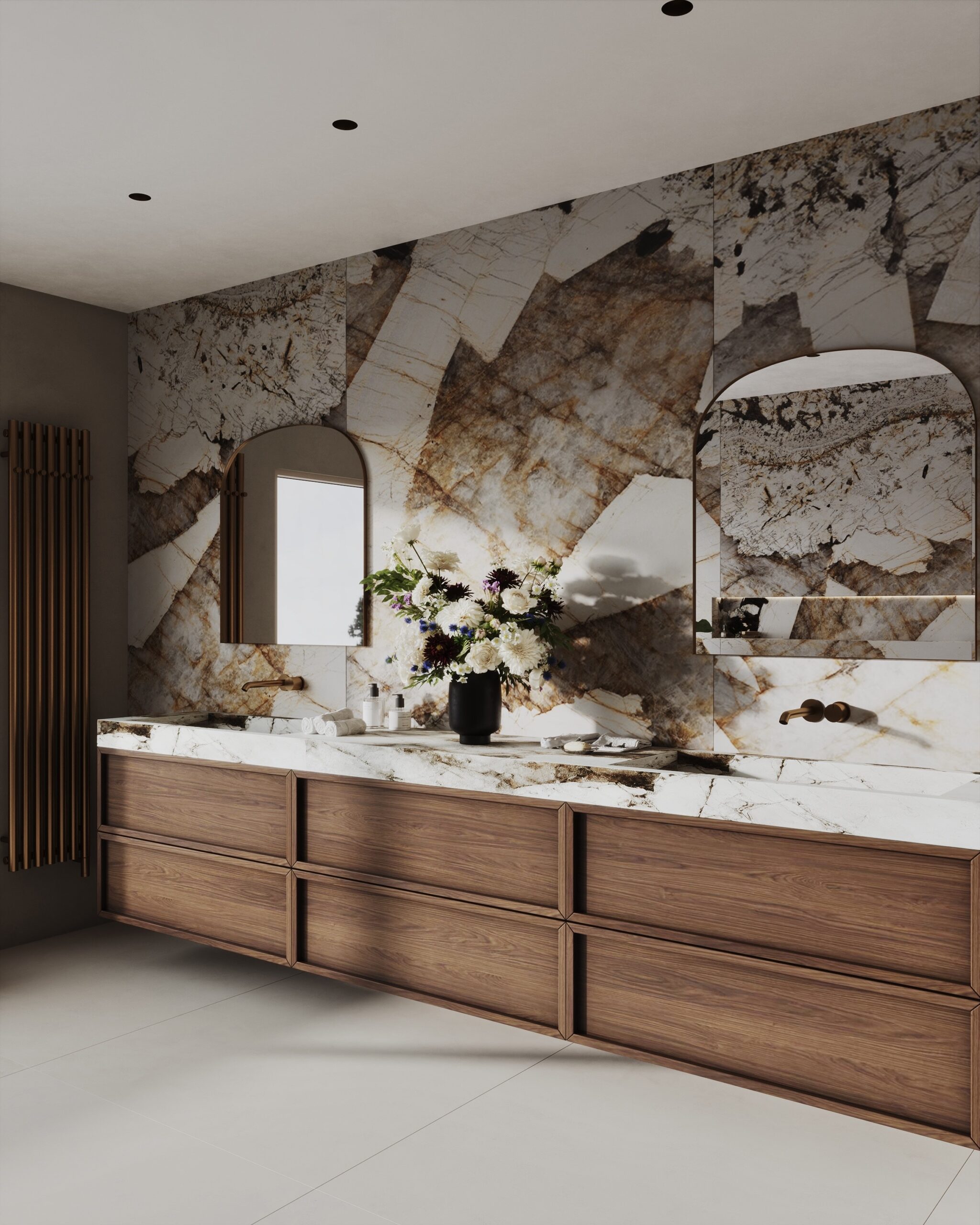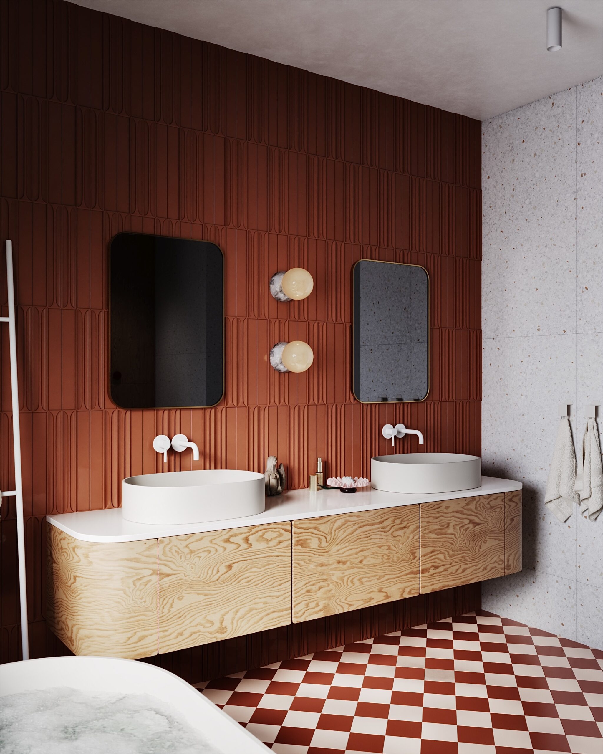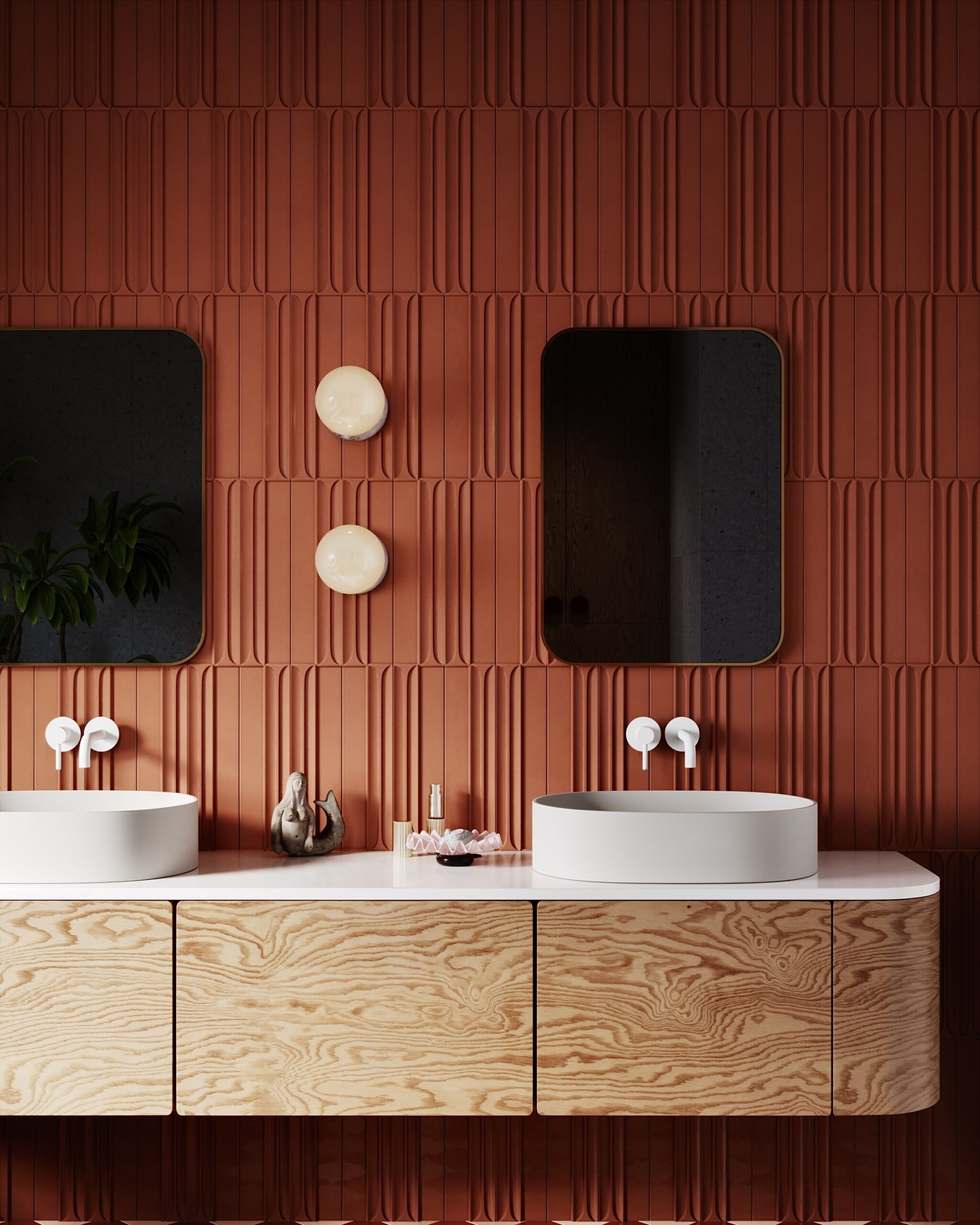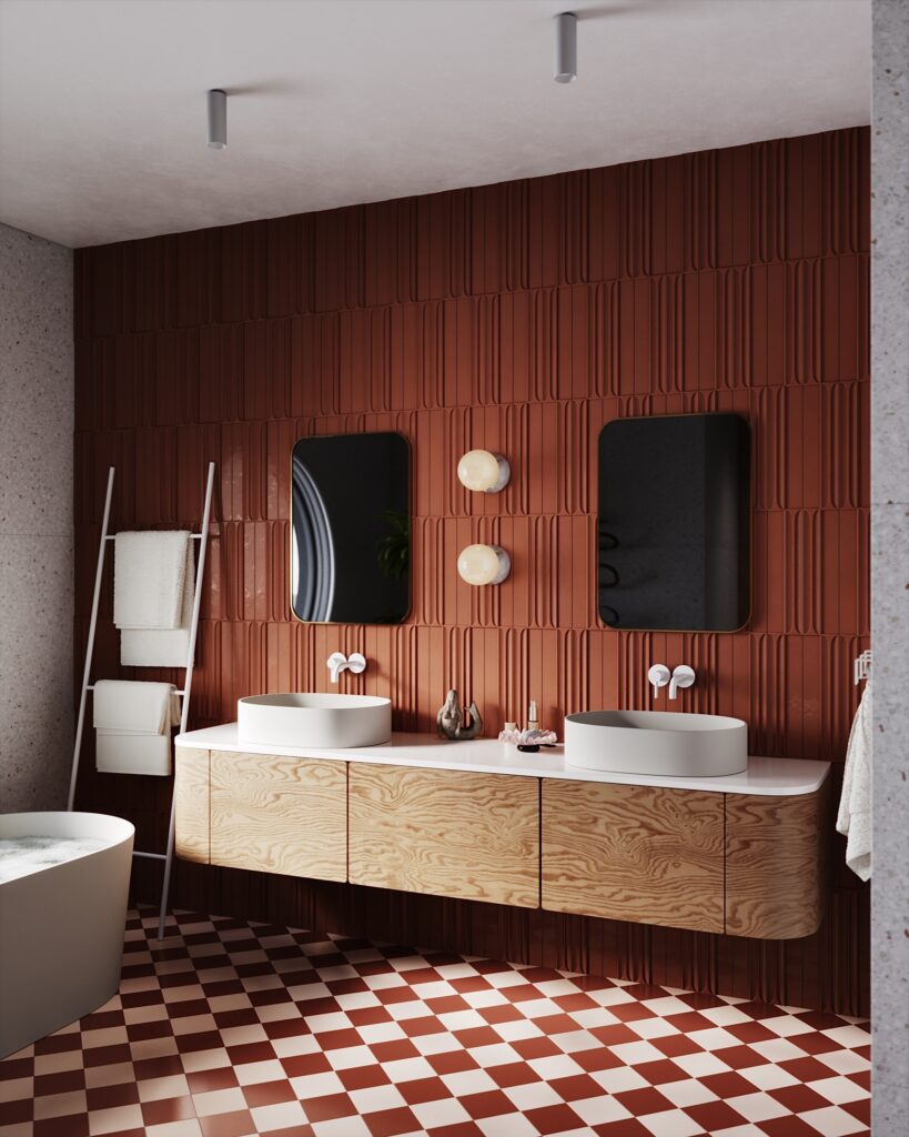 Paní majitelka toužila po výjimečné koupelně. Je milovnicí terracota odstínů, retro prvků a oblých tvarů. A my měli volnou ruku.