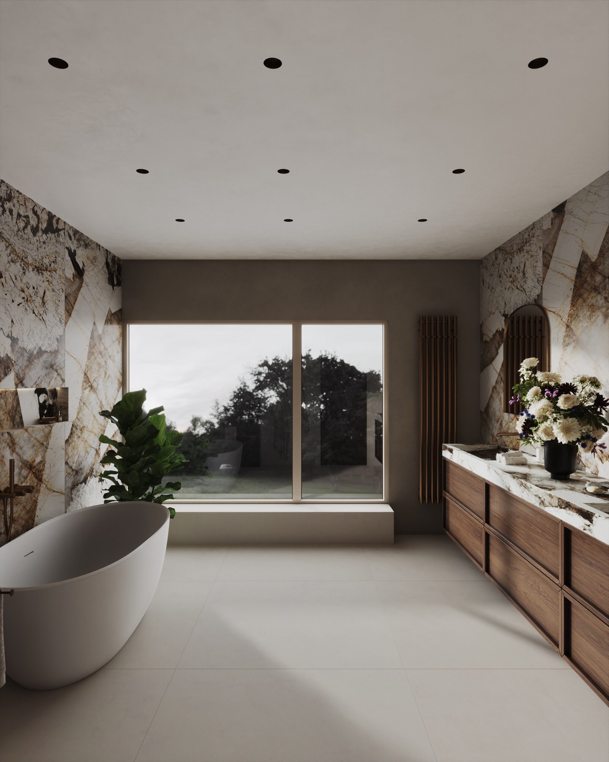Dominantou koupelny je 2,7m velké dvojumyvadlo z naší dílny. S tímto půdorysem se pracovalo skvěle. Vznikla nádherná velkorysá koupelna s dostatkem úložných prostor a úžasným výhledem do zahrady. Zajistili jsme do koupelny veškeré obkladačské a truhlářské práce.