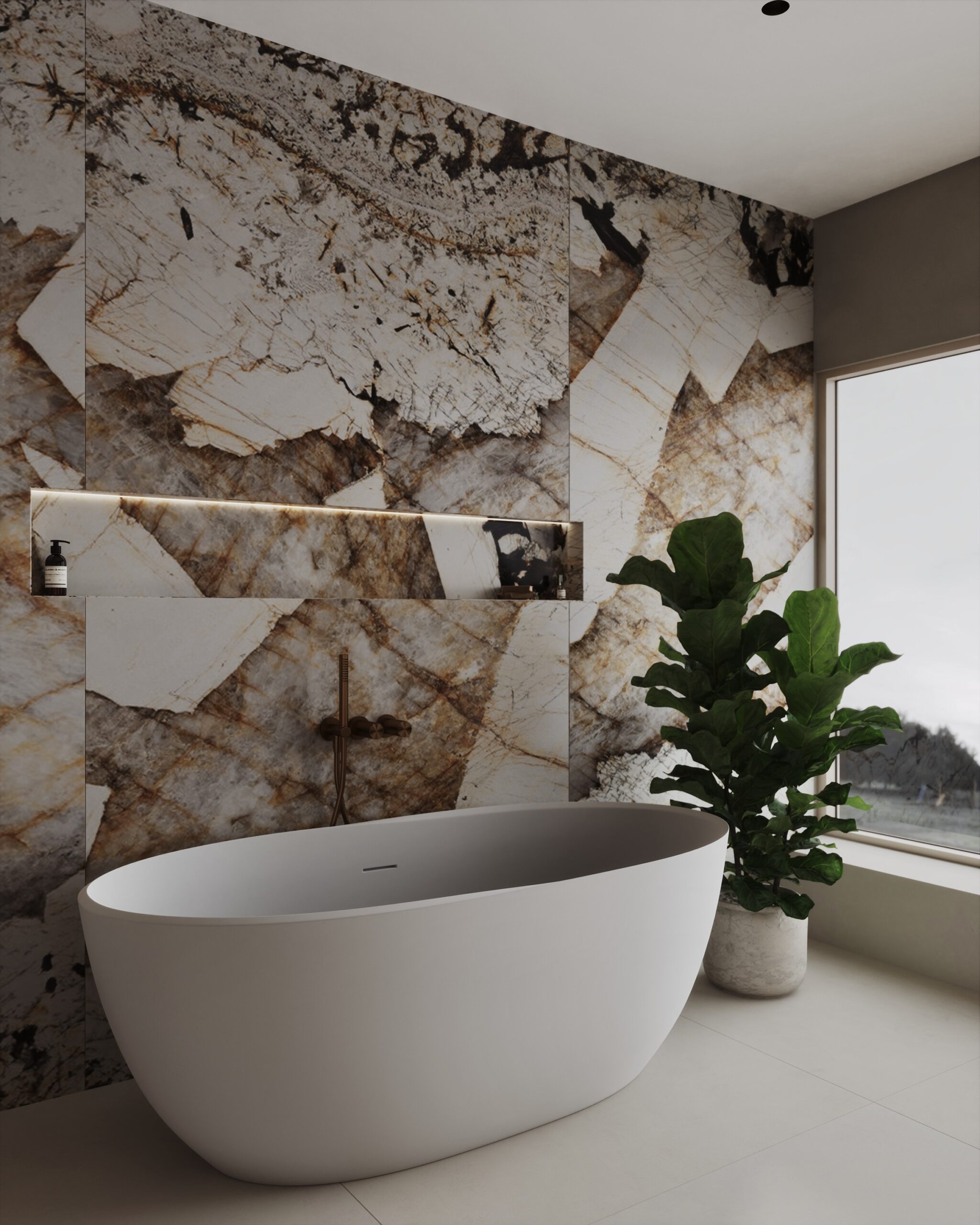 Majitelé se na první dobrou zamilovali do maxiformátu Patagonia, který měl v koupelně spolu s tmavým dřevem hrát prim.