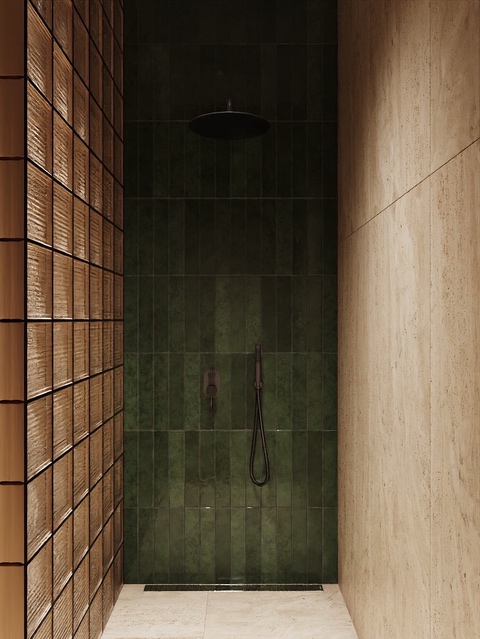 Koupelna bohužel nemá zdroj denního světla. Ten jsme zasuplovali aspoň luxferovou stěnou směrem ke kuchyni. Vybraný travertin za nás krásně funguje s vybranými zelenými maloformáty. Projekt z kapacitních důvodů bohužel nerealizujeme.