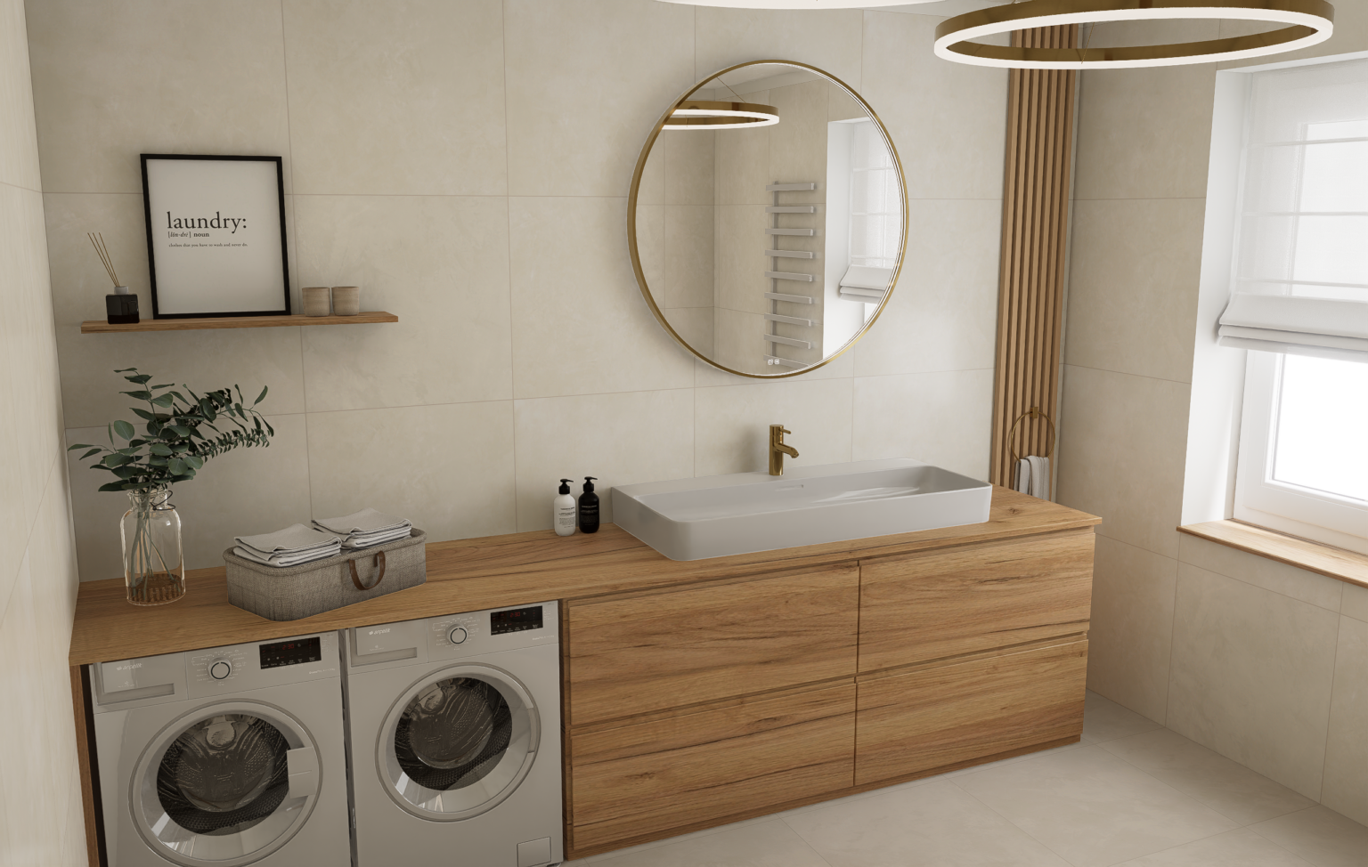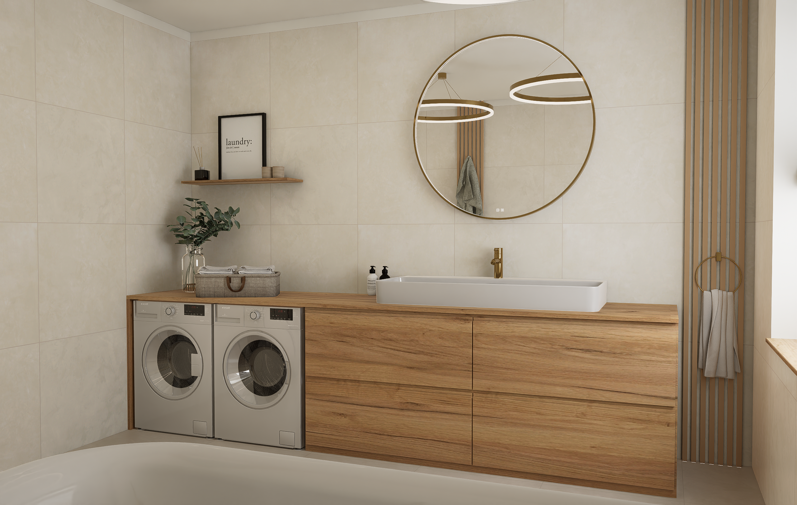 My si s tím poradili, ušetřili majitelům peníze, zastřešili kachle, obkladačskou a také truhlářskou práci. Kachličky jsme volili ekonomicky v rozměru 60×60, povedlo se vybrat nádhernou imitaci stěrky v ginger a moon odstínu. Komoda je v odstínu dub halifax.